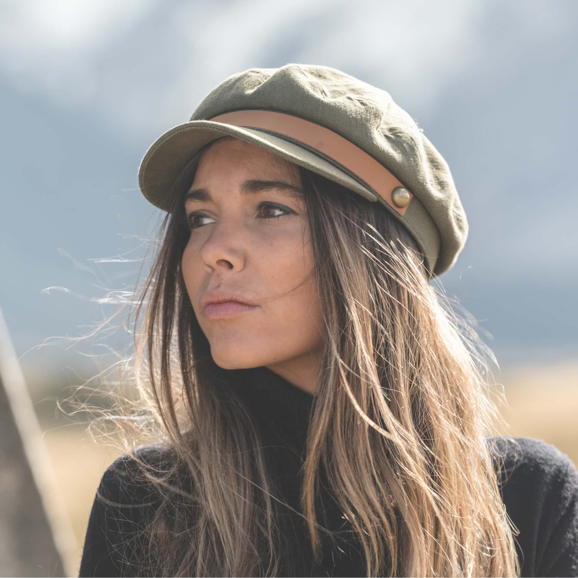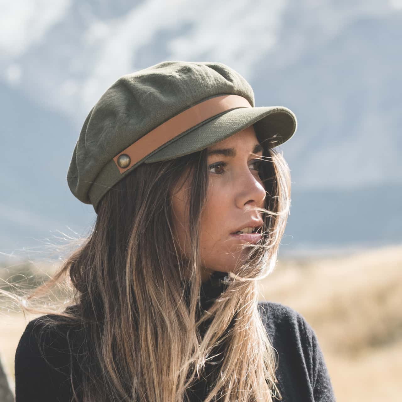 The Foster Green baker boy cap is a cotton canvas, vintage-inspired field cap made for every season. The unisex cap is trimmed with a brown tan leather.